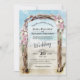Esta hermosa invitación a la boda es perfecta para una boda en la playa o en el destino. Está decorado con un bonito arco de color marrón o una pérgola adornada con rosas rosas rosas y blancas y el océano al fondo.