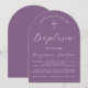Una invitación al bautismo simple, moderna, con forma de arco y neutral en cuanto a género. Sólo tiene texto blanco sobre fondo polvoriento morado. En la parte superior hay una cruz blanca con texto en arco encima de ella. La ocasión y el nombre están escritos en guión.