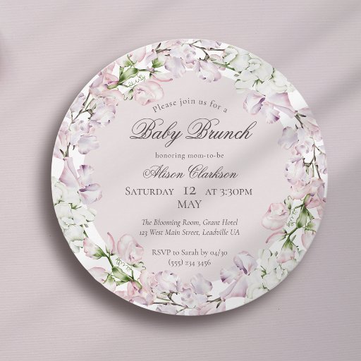 Celebre una visita especial de mamá con esta encantadora invitación a la ducha floral, con delicadas flores de guisantes dulces en suaves tonos rosa, lavanda y blanco en forma de arco. El borde floral crea un ambiente romántico inspirado en el jardín, mientras que el arco añade un toque único e inolvidable. Perfecto para un brunch o una ducha de bebé, esta invitación combina elegancia con un toque de primavera fresco. Una manera dulce de reunir amigos y familia en honor de la próxima llegada.