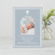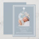 Fondo azul turbio, decorado con un marco blanco, y cruz blanca Personaliza y añade un nombre de foto y detalles. Texto blanco. Marco fotográfico en forma de arco.