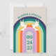 Invitación de boda arco iris de los años 70 retro con palomas y grandes cantidades. Gran fuente retro elegante hace que sea super genial y groovy. ¡Esta invitación de diseño es digna de destacar! Maravilloso y colorido, es perfecto para un ambiente boda hippy y relajado. Cuenta con fechas de boda populares y grandes. Los detalles del boda están en la parte de atrás. Vea la coordinación de artículos en nuestra tienda.