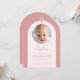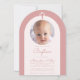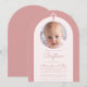 Una invitación moderna para el bautizo de una niña. Dentro de un arco de rosa polvoriento, hay un arco de color rosa suave muy claro, casi blanco, con una foto circular de marcador de posición y texto rosa polvoriento dentro. Sobre la foto, hay una cruz de color rosa polvoriento. La ocasión y el nombre están escritos con una letra manuscrita.
