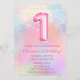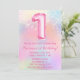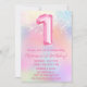 Invitación de primer cumpleaños del arcoiris rosado Purpurina  de primer cumpleaños para un chica de un año con escritura moderna y divertidos globos de Relieve metalizado.