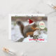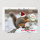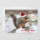 Foto de una ardilla de Navidad en caída de nieve usando un sombrero de Papá Noel y diciendo "Feliz Navidad" en un globo de voz. La ardilla linda está comiendo un maní y sentada en una roca rodeada de nieve en el suelo. "Feliz Navidad" está escrito en rojo y verde festivo. Esta foto de ardilla sería una manera perfecta de desear a alguien una Feliz Navidad durante la temporada navideña y se puede imprimir en muchos productos diferentes.