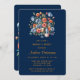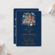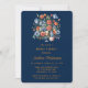 Un ilustracion acuático de un aroma de peonía brillante en azul marino y naranja. El ramo consiste en peonías con grandes flores redondas y hojas verdes profundas. El fondo es azul marino. Las invitaciones coincidentes y los suministros de boda están disponibles en este conjunto de colecciones