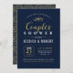 Esta elegante invitación a la ducha de boda para parejas incluye una hermosa tipografía de oro sobre un fondo marino. Puede personalizar del color de fondo.
