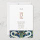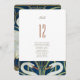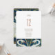 Esta tarjeta numérica es una obra maestra de la sofisticación Art Deco, mostrando la elegancia icónica de los cisnes ambientados en un llamativo fondo azul marino con lustosos detalles de oro. El diseño presenta un par de cisnes en una imagen de espejo, con sus plumas blancas delineadas con oro, creando un impresionante contraste con el fondo oscuro y rico. Por encima de los cisnes serenos, el número de la mesa se muestra de forma destacada en una fuente grande y elegante que complementa el diseño general. La carta se completa con una lista de huéspedes en un tipo de letra que combina a la perfección con la temática refinada y elegante de su boda.
