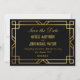 Personalice esta elegante y original Boda de estilo Art Deco Gran Gatsby de los años 20. Guarde la tarjeta de fecha con texto falso en color oro y marco vintage sobre un elegante fondo negro. Tenga en cuenta que el oro de este diseño es una impresión de color amarillo plano y no es un Relieve metalizado metálico real.