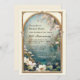 INVITACIÓN DEL 50 ANIVERSARIO con colección de decoraciones de fiesta de papel y foto | Un hermoso marco Art Déco dorado envejecido y antiguo rodea la imagen frontal de un hermoso jardín de flores brumosas con agua corriendo a través de él y en el reverso hay un marco dorado Art Déco con tu fotografía que se puede subir proporcionando una hermosa foto recuerdo para familiares y amigos que asistirán a la celebración. Las flores de Magnolia blancas y las flores pastel de color rosa pálido brillan contra un cielo etéreo brumoso. Diseñado gráficamente por la artista y diseñadora licenciada internacionalmente, Audrey Jeanne Roberts