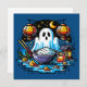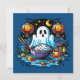 Arte de diseño gráfico de un fantasma con arroz y linternas para el Festival del Fantasma Hambriento.