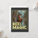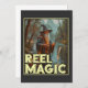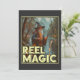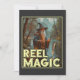 Esta imagen caprichosa muestra un mago parado al lado de un río en una zona boscosa, sosteniendo una barra de pesca con un pez flotando hacia la línea. Vestido con atuendo tradicional de mago, incluyendo una bata larga y un gorra puntiagudo, el mago lanza un hechizo mágico mientras pesca. El fondo, arbolado y montañoso, crea un ambiente místico y sereno. El texto "REEL MAGIC" que se muestra de forma destacada en la parte inferior de la imagen, añade un toque humorístico y mágico a la escena.