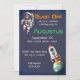 Esta invitación de los personalizados a las partes incluye un tema relativo al espacio ultraterrestre. Una imagen de un astronauta aparece en la parte superior izquierda. Se coloca una foto de muestra en el casco del astronauta que se puede reemplazar con su propia foto o imagen de personalizado. El planeta Tierra se ve a distancia con un barco que dispara desde él. El fondo es azul oscuro con estrellas tenues y un borde de patrón de galaxia.