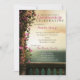 Esta invitación para el cumpleaños de Quinceañera cuenta con un balcón encantador. En la parte superior hay rosas rosadas bonitos que trepan una columna y una cadena de luces rosas. Este mágico balcón da a un hermoso cuerpo de agua y cielo. Algunos gráficos de Origins Digital Curio en www.etsy.com/shop/OriginsDigitalCurio