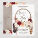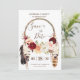 Tu celebración boho puede ser rústica y elegante al mismo tiempo. Este hermoso diseño de "Save the Date" presenta lo mejor de ambos mundos. Con hermosas flores de acuarela en rosa suave, rosa borgoña y melocotón delicioso que adornan un atrapasueños boho con plumas y flores, este diseño seguramente emocionará a tus invitados en anticipación de tu gran día. Coincide con otros diseños en nuestra tienda para crear un conjunto completo y es totalmente personalizable para cualquier ocasión. Puede ser utilizado para una boda, cumpleaños, despedida de soltera o baby shower, graduación o cualquier otro evento importante.