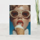 Un sorprendente acercamiento de inspiración retro a una glamorosa mujer con gafas de sol gigantescas que disfruta de un cremoso cono de helado bajo el sol. La imagen presenta pintalabios rojos audaces, piel impecable y un elegante suéter de waffle-cuchilla, encarnando la moda vintage con un toque moderno.