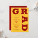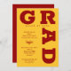 GRAD en negritas curvas cardinales de letras rojas alrededor de los bordes de estas invitaciones a la fiesta de graduación de oro amarillo. COINCIDIENDO elementos de nuestra colección.