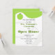 Una invitación en tonos verdes y blancos. El frontal presenta un diseño verde en la parte superior y ilustracion de manzana verde en la parte superior izquierda. Fondo de Swirl. Personalice con el nombre, grado, ubicación y fecha de su regreso a la escuela, orientación de casa abierta. El lado opuesto es verde sólido.