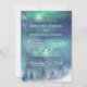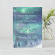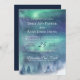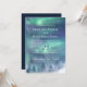 Románticas luces boreales inspiraron la invitación a la boda en tonos azules, púrpura y verde, con altos pinos de montaña y un cielo estrellado que reluce para un toque de brillo.