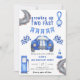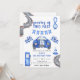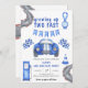 Fiesta de cumpleaños. Invite a los huéspedes a una fiesta de cumpleaños con estilo con carrera de autos. Pista de carreras acuáticas, gasolinera, bandera de la carrera, auto de carreras azul.