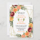 This fun and whimsical wedding invitation features watercolor burgundy red and orange flowers with foliage on a gold geometric frame. The text combines handwritten script and serif fonts for a stylish and modern look. This is perfect for an autumn fall rustic wedding.