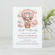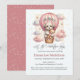 La fascinante "Let the Adventure Begin", con una invitación a una ducha de bebé con temática de adorable cachorro sosteniendo a un oso de peluche montando en un globo de aire caliente de color rosa malva. El fondo son acuarelas con nubes blancas, rosas y azules y estrellas doradas. Patrón estrella blanca sobre color rosa malva en la parte posterior de la invitación. Plantillas proporcionadas.