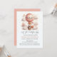 Captílica invitación a la ducha con temas de "Let the Adventure Begin" con un adorable zorro sosteniendo un oso de peluche montado en un globo de aire caliente rosa y de color rosa. El fondo del cielo acuático es rosa claro, con nubes blancas y estrellas doradas y globos flotantes. Patrón de estrella blanca sobre rosa de color sólido en la parte posterior de la invitación. Plantillas proporcionadas.