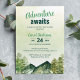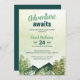 Un encantador diseño acuático con montañas, pinos y un ambiente rústico, perfecto para una ducha de bebé de temática masculina. "aventura espera" Fácilmente personalizar con los detalles de su fiesta.