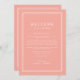 Este suave itinerario de fin de semana de melocotón de color melocotón del Avery Suite presenta un moderno tipo de serif blanco, un delicado marco de doble línea y una amplia distribución. El estilo moderno y minimalista es acogedor y romántico para los bodas contemporáneos. En la parte delantera de la nota de la bolsa de bienvenida se incluye una carta de bienvenida boda y en la parte trasera está la cronología del itinerario boda. Estas notas son perfectas para bodas de destino y bolsos de bienvenida para huéspedes del hotel.
