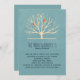 Una invitación a una reunión familiar con un fondo verde sobre la superficie es un árbol amarillo claro con dos siluetas de pájaro naranjas sentadas sobre las ramas.