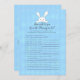 Un conejo blanco encima del título del juego con fondo azul bebé, de diamante. Plantillas creadas para usted. Este es un juego de ducha de bebé que conoce a la futura mamá.