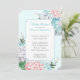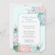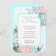 Invitación en colores pastel bonita de la fiesta de bienvenida al bebé, con los gráficos de hydrangeas y de puntillas en colores pastel rosados, azules, y blancos de la respiración del bebé, contra un fondo pálido del azul de la aguamarina. Un área de texto blanca hecha muescas en azul del borde de la aguamarina, en el centro, tiene texto de encargo listo para personalizar.
