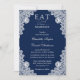 Complemente su fiesta de bodas rústica de color azul marino con estas elegantes y románticas invitaciones de boda con encaje floral blanco sobre un fondo azul marino.
