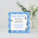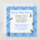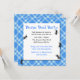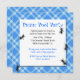 Invitación del fiesta del cuadrado de la diversión hecha en un modelo moderno azul y blanco de la tela escocesa con un área de texto blanca de centro. Los gráficos de hormigas negras miran para arrastrarse por todo la invitación. Todo el texto está adaptable y listo para personalizar para su fiesta del verano.
