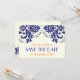 Preciosa tarjeta de anuncio de boda damasco Save the date. Este diseño moderno y contemporáneo presenta un motivo damasco en azul marino y coral.