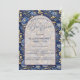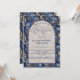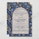 Esta invitación a la ducha de novia muestra una pieza central suave en forma de arco que enmarca suavemente los detalles del evento, dando un sentido de elegancia y enfoque. Alrededor de esta zona central hay una exuberante frontera de flores azules y doradas, delicadamente recubiertas y ricamente detalladas, que añade profundidad, calidez y un encanto de celebración. La interacción entre el arco estructurado y los acentos florales orgánicos crea una composición equilibrada que se siente a la vez refinada y atractiva. La parte trasera de la tarjeta tiene el patrón azul y florido de golf - también hay una versión con un fondo azul marino.