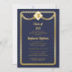 Un tope de graduación de oro y el marco serpentino redondeado color oro y diseño de invitación a fiesta de graduación azul que puede ser personalizado para graduaciones de secundaria, universidad, universidad o escuela vocacional. Diseño compuesto por Holiday Hearts Designs (derechos reservados).