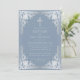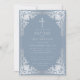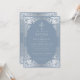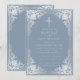Esta elegante invitación de bautizo azul polvoriento y plateado con aire vintage, recomendada para niño, tiene un marco ornamentado de falso foil plateado con elegantes decoraciones grises plateadas barrocas sobre un fondo azul polvoriento. Sobre el texto hay una cruz religiosa en falso foil plateado. Todo el texto se puede personalizar y tiene un color gris plateado similar al marco de falso plateado.