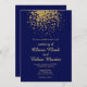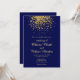 Esta elegante y moderna invitación a la boda tiene un toque de oro en un rico fondo azul real.