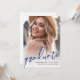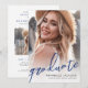 Anuncio de graduación y invitación a la fiesta minimalista simple. La parte delantera presenta una foto a página completa con "Graduado" en letra manuscrita azul negrita en la parte inferior para un aspecto fresco y de celebración. A continuación, el nombre del graduado, "Clase de 2025" y el nombre de la escuela aparecen en una mezcla limpia de fuentes azules y negras, sobre un gradiente blanco suave que se desvanece suavemente en la imagen para que todo permanezca claro y legible.