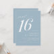 Moderno y dulce dieciséis invitaciones con acentos de guión. Sencillo, informal y bonito. Color azul claro silenciado con fuente blanca.