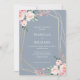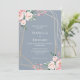 Invitación a la boda de personalizable en azul polvoriento. Los ramos florales de bonito, en tonos rosa rosa y rosa polvoriento, están decorados con un marco geométrico dorado moderno.