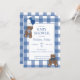 If you can "bearly" wait for the arrival of baby boy, customize this shades of blue and white buffalo check (plaid), teddy bears, ribbon bows, and balloons baby shower invitation. The back of the card features the same gingham background.