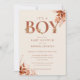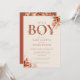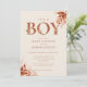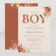 Invitación de baby shower de niño que presenta tipografía de terracota elegante y follaje floral rústico. Diseñado por Thisisnotme