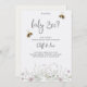 A baby gender reveal invitation card features delicate floral illustrations at the bottom with two bees buzzing above elegant script text. The back is a plain, light textured design. The tone is inviting and whimsical.