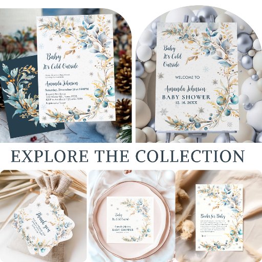 Elegant Baby It's Cold Outside Baby Shower Invitation in stunning navy blue and shimmering gold! Delicate winter florals, frosted blue branches, glittering snowflakes, and golden berries create a luxurious, icy-chic look perfect for December or January celebrations. Ideal for gender-neutral, winter wonderland, or “little snowflake” themes.