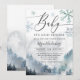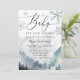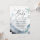 Carta de invitación moderna a la ducha para bebés con arte acuático de la montaña invernal con pinos con copos de nieve. El texto dice "Bebé, hace frío afuera".