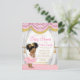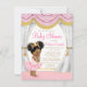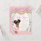 princesa afroamericana rosa y dorada invitaciones a la ducha de bebé con adorables bailarinas de la princesa africana étnica norteamericana con lindos colas de ponis y arcos con un tutu rosado de bonito, una cuerda de perlas y una corona de oro de bonito sobre un hermoso fondo rosa y dorado de cortina. Estas hermosas invitaciones a una ducha de bebé afroamericana rosa y dorada se personalizan fácilmente para tu evento simplemente agregando tus detalles en el estilo de letra que prefieras.