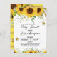 Moderna invitación a la ducha de bebé con temática neutra de género, con diferentes arreglos florales de girasol y algunas adorables abejas color agua.
