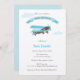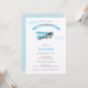 Una encantadora invitación a la ducha de bebé personalizable con un avión azul y marrón. pegatina de favoritos, etiqueta de dirección y etiqueta de direcciones coincidentes