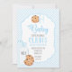 leche y galletas de bebé ducha invitan en azul con galletas de chocolate y botellas de leche y pajitas azules.